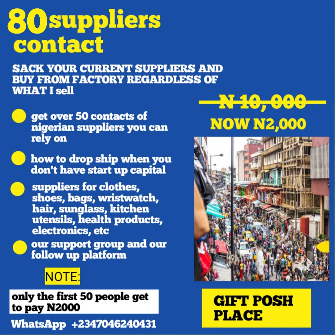 Get the 80+ contact of major suppliers of different items in Nigeria, including shoes, clothes, hair, bags, jewelry, Home appliances, household, kitchen, etc.